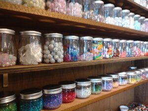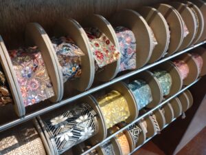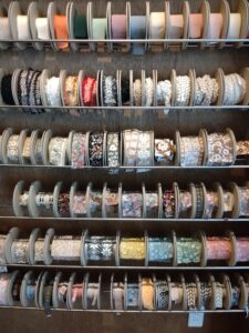 あたたかく上品な壁一面の木の棚いっぱいに飾られているカラフルなリボンやビーズたち。